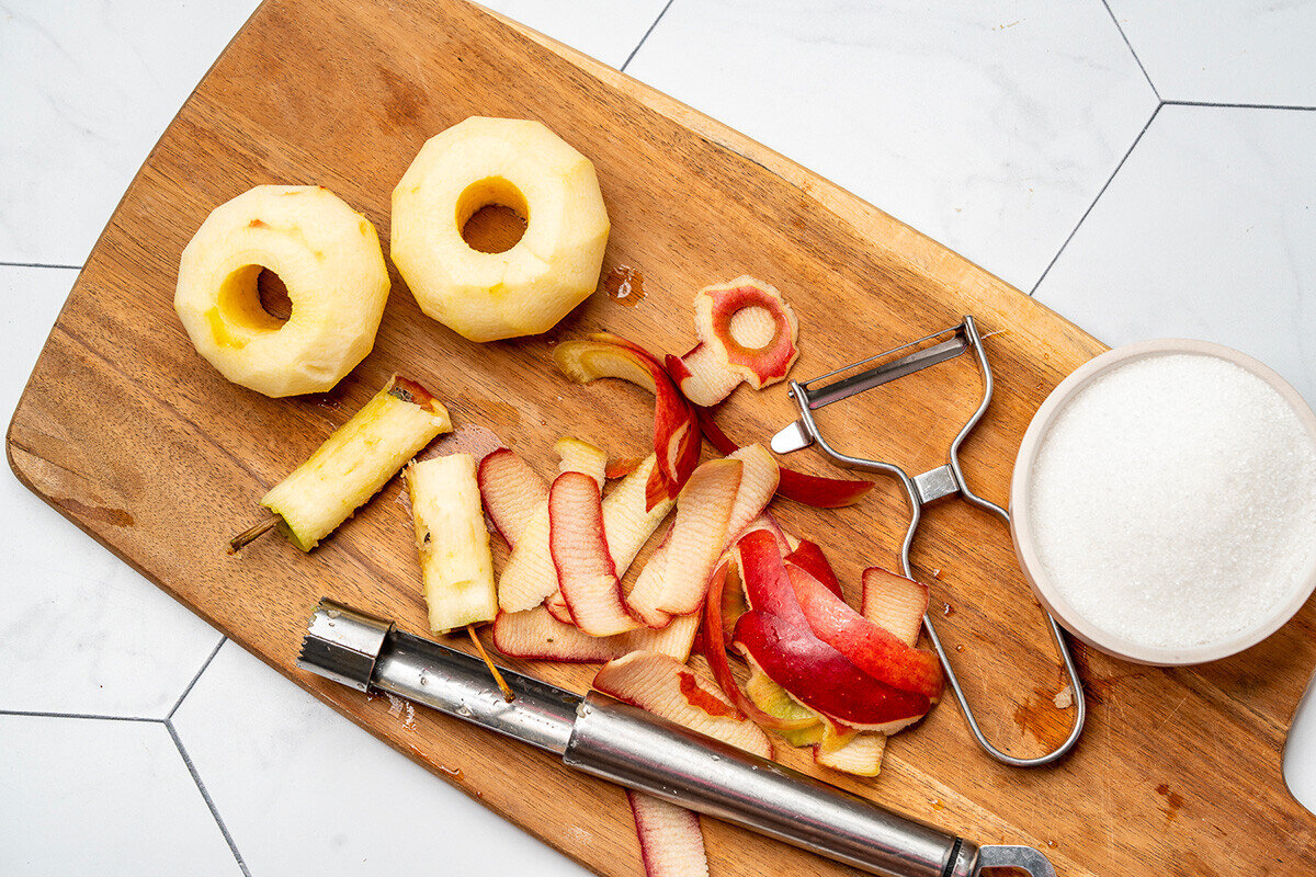 - Ogni volta che si utilizzano le mele per un’altra ricetta, conservare le bucce in un contenitore pulito. Se non si intende utilizzarle immediatamente, è possibile conservarle in frigorifero per alcune ore.